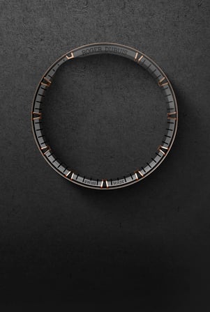 Rehaut double surface gris avec minuterie gravée, textes décalqués, index des heures plaqués or rose et polis avec SLN au centre