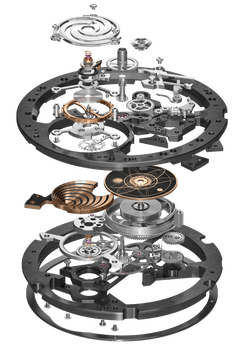 由羅杰杜彼製錶廠打造的RD515機芯,位於機芯7時位置的飛行陀飛輪,彰顯Roger Dubuis 羅杰杜彼的標誌性設計。為實現Dr. Woo的奇幻構想,Roger Dubuis羅杰杜彼的製錶師特意重新設計陀飛輪框架:保留下層鈦金屬框架,將上層橋板簡化為三臂造型,以容納靈感源自「陀飛輪星系」的螺旋圖案。該裝飾採用精鋼製作,不但有利精密工藝,更能展現Roger Dubuis羅杰杜彼經典的鏡面拋光效果,營造閃耀光澤。除了72小時動力儲存外,RD515機芯更獲得Poinçon de Genève日內瓦印記,不僅證明來源和可靠性,更證明其工藝品質,機芯中的193枚零件均經過16種不同的卓越手工裝飾。