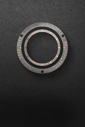 此款时计的正面以对比鲜明的玫瑰金和灰色同心圆作为装饰,每个同心圆的高度不同,错落有致的设计让下方的镂空机芯一览无余,尽显超级腕表 (Hyper Horology™ ) 特有的表现力。打破常规的飞行指针另需一个巧妙的全新时间设置系统,该系统目前正在等待专利通过。