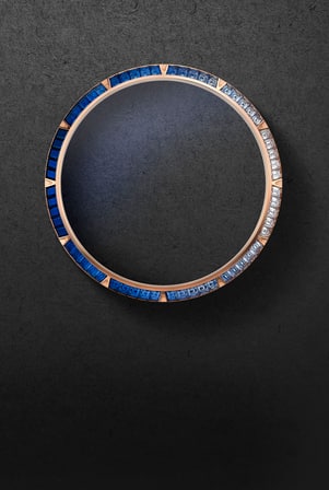 Pink Gold 750/1000 case with open case back Sapphire crystal, Pink Gold 750/1000 bezel set with 60 baguette-cut blue sapphires and diamonds