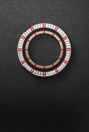 Pink gold case Pink gold bezel set with baguette-cut diamonds Pink gold crown Pink gold open case back sapphire crystal